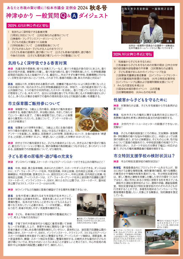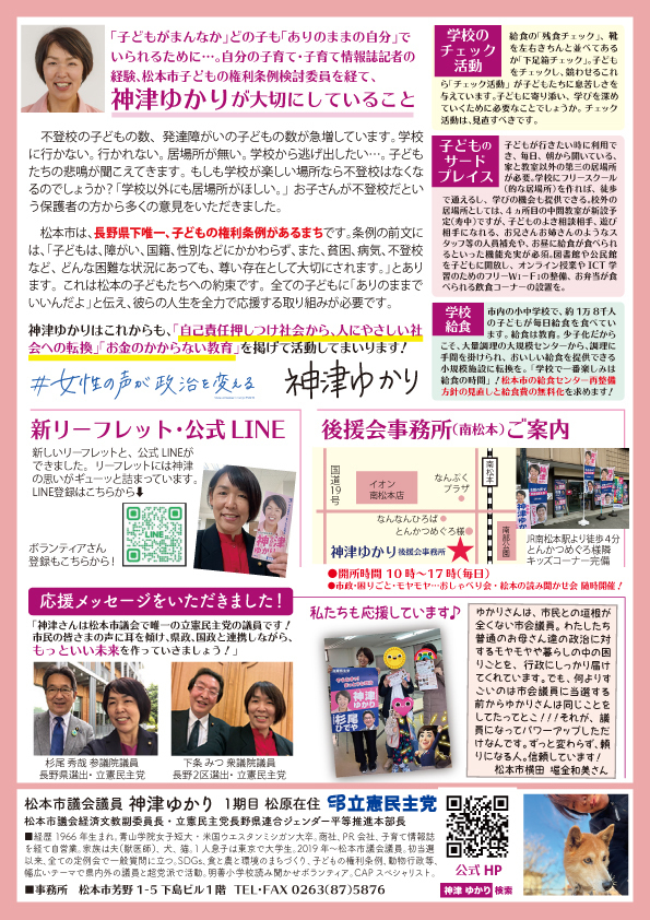 ●松本市立病院の産科は継続を!●学校給食センターは自校給食を含めた小規模施設への段階的な転換を!●場所(居場所・公園・学習や運動)の充実●学校の内申書(評価)・宿題の見直し●子どもファーストの公園や子どもセンターを作ります。